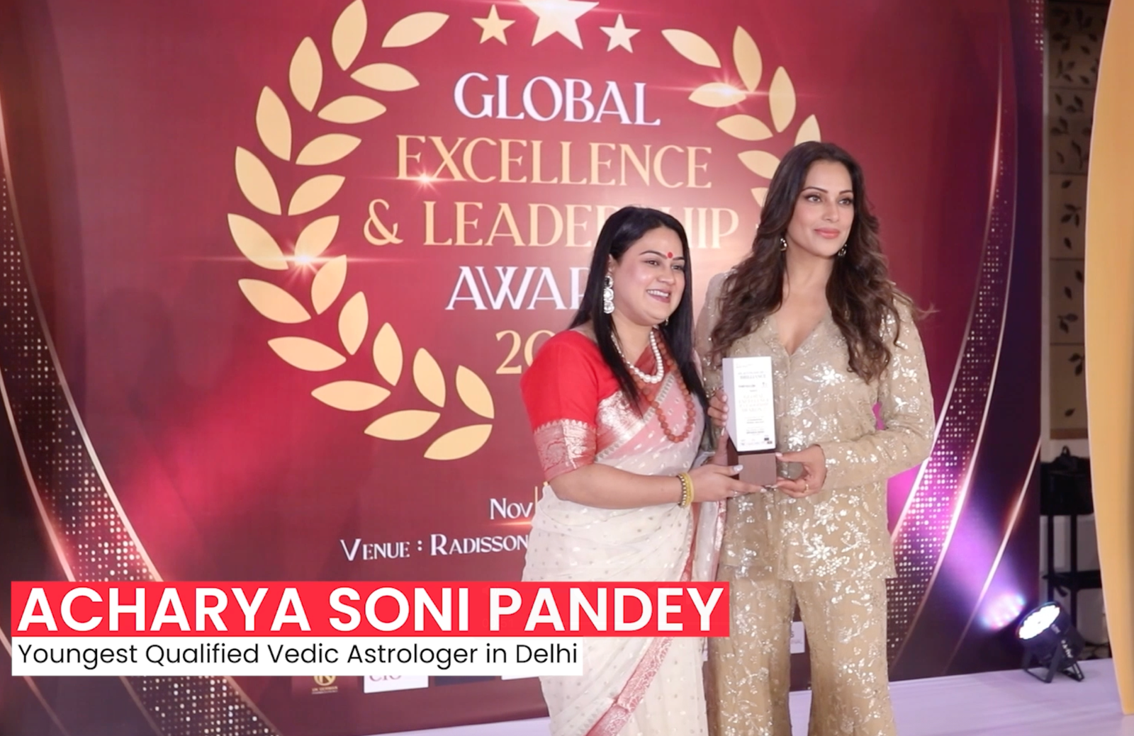 Acharya Soni Pandey Ji holds a B.A. (Hons) and M.A. in Sanskrit from the University of Delhi, with a strong academic focus on Vedic studies. She has studied all six Vedangas—Shiksha (phonetics), Kalpa (ritual procedures), Vyakaran (grammar), Nirukta (etymology), Chhanda (prosody), and Jyotish (Vedic astrology). Among these, Jyotish Shastra has been her primary area of mastery, spiritual inclination, and dedicated practice. She approaches Jyotish not merely as predictive astrology, but as a sacred Vedic science that guides individuals toward karmic balance, self-awareness, and spiritual growth. At a young age, she gained notable recognition in the field of astrology and has successfully guided many individuals through practical, Vedic-aligned remedies rooted in traditional wisdom. In 2025, she was honored with the “Youngest Astrologer Award” and received recognition at the Global Excellence Leadership Awards 2025 held at Radisson Blu, Dwarka, New Delhi. Her scholarship, devotion, and disciplined study make her an inspiring representative of authentic Vedic astrology in the modern era.
